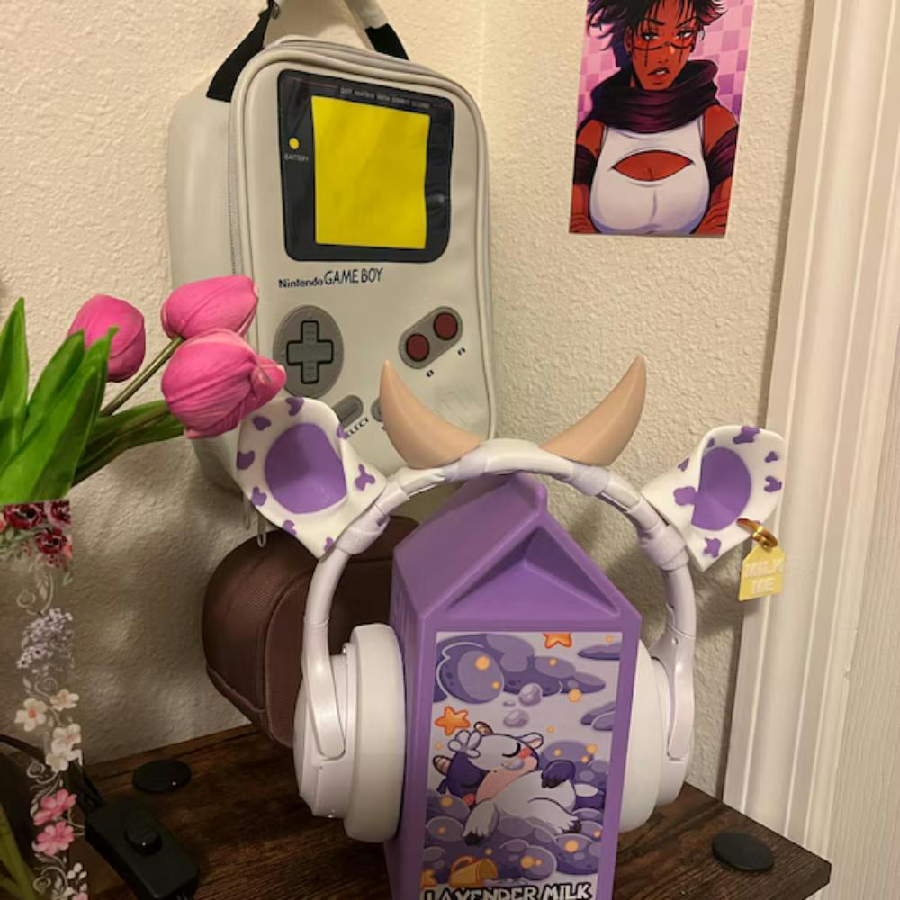 I love the purple cow ears so much and it looks so stinkin cute on the milk cartoon headphone stand.