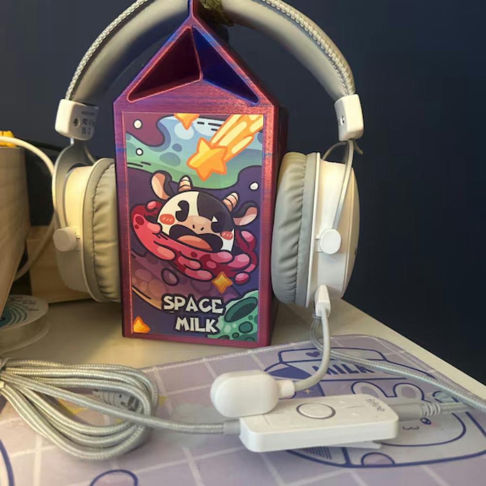 The "UMoo" milk carton headphone stand is a delightful blend of functionality and cuteness! Designed with a kawaii, cute gaming aesthetic, this headset stand is the perfect accessory to showcase your beloved headphones.