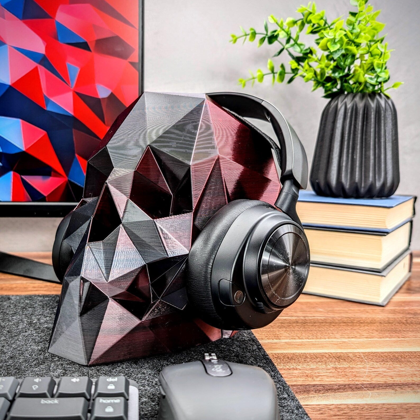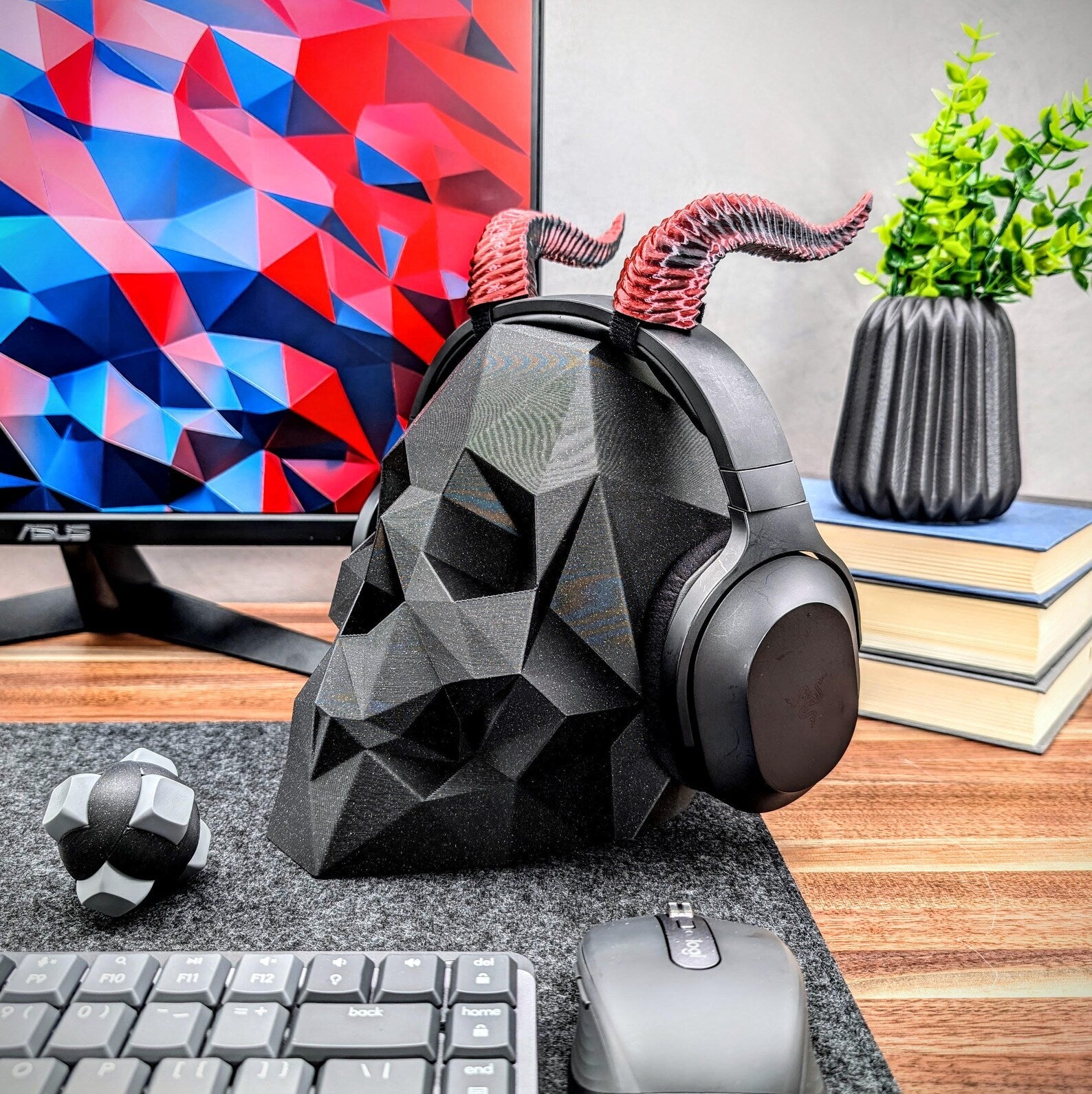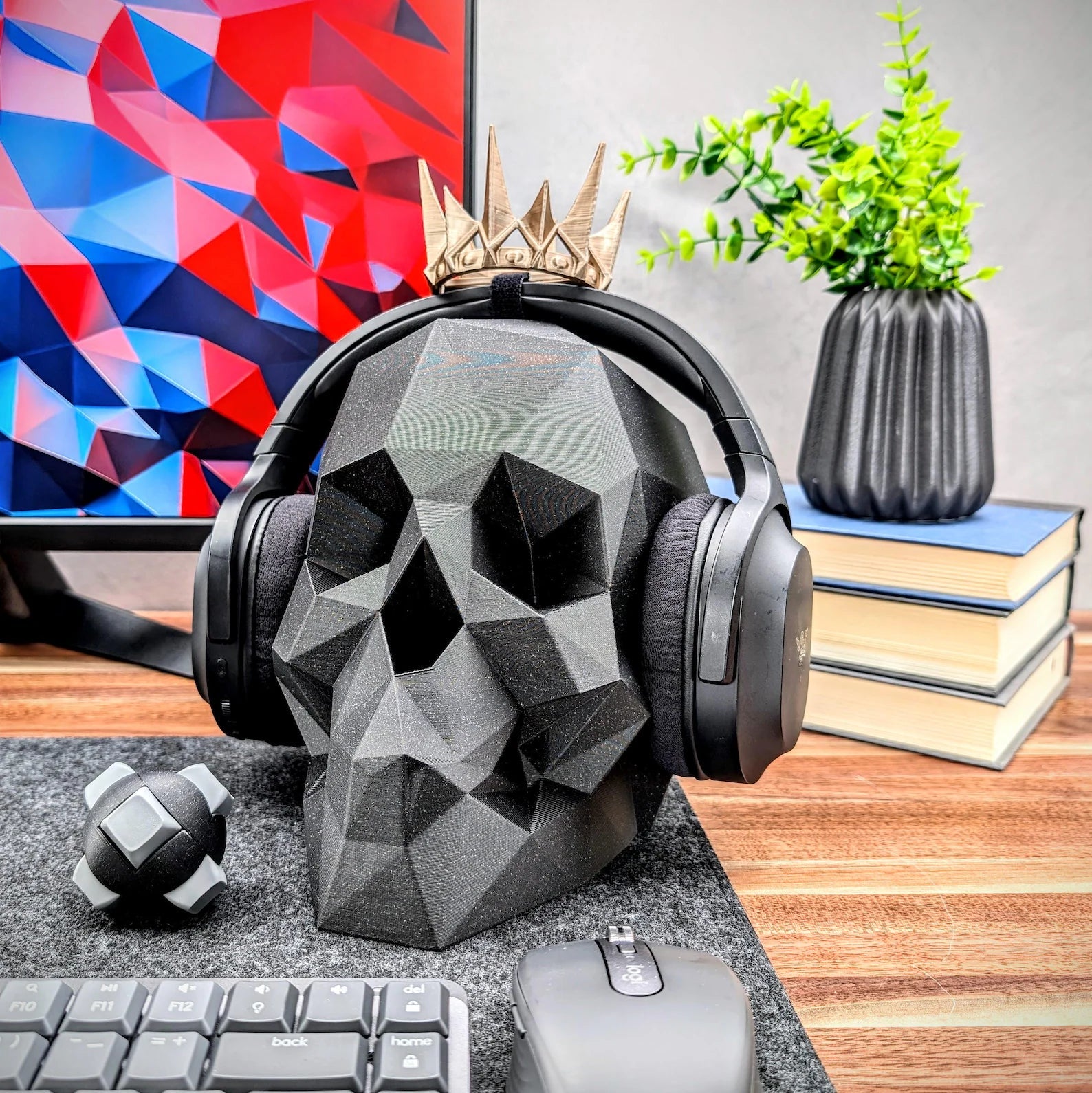 The low poly skull headphone stand is an awesome way to showcase your headset on your desk. Add this geometric skull to your gaming setup and enjoy the minimal design. A great gift for that special someone for Christmas, birthdays, or make it a treat for yourself.